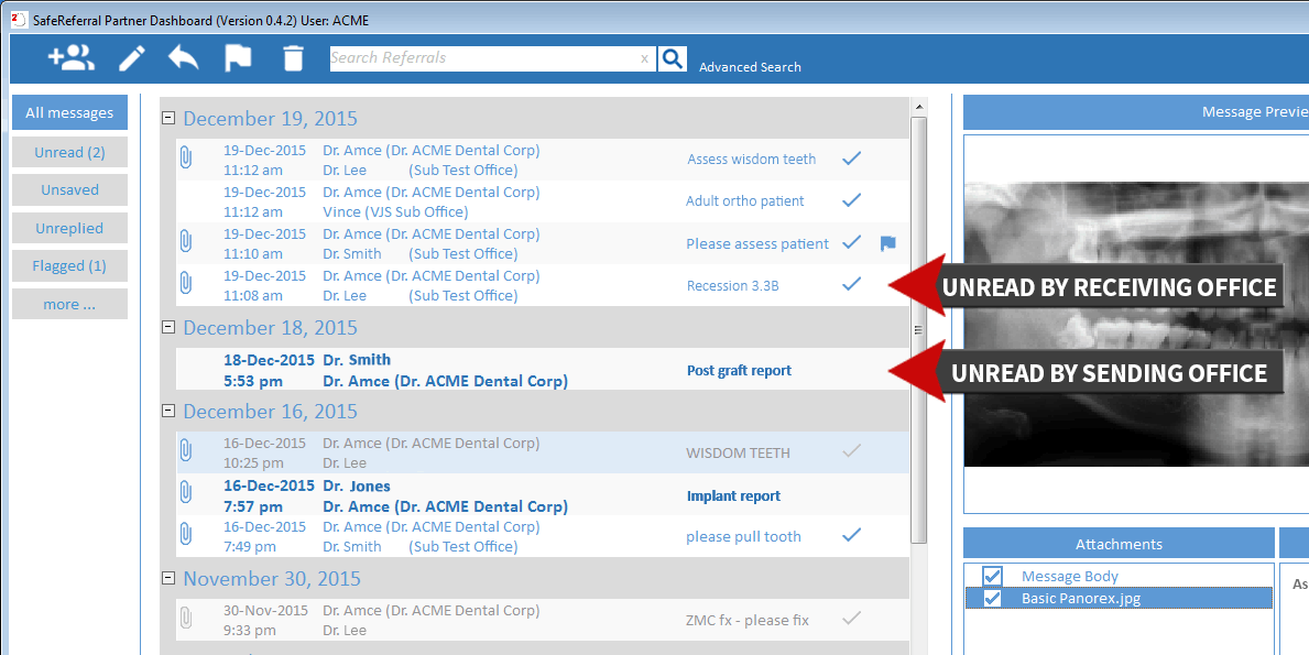 Count by specialist: For offices who send referrals, SafeReferral places a desktop icon for each specialist. This allows you to drag-n-drop files or start referrals to whichever specialist you choose. Those same icons will show an individual count of messages that have arrived to keep you aware of file transfers.