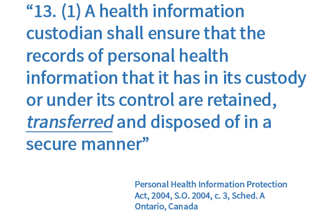 PIPEDA*, PHIPA** section 13(2) and the findings HO-004 and HO-007 are clear; data in transit or on mobile devices must be highly encrypted. The responsibility to keep the data encrypted rests with the ‘information custodian of record’ (typically, the practitioner).