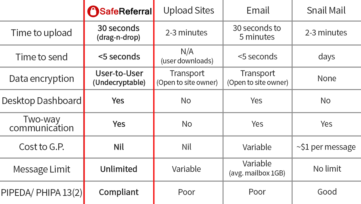 SafeReferral is quicker and easier to use than upload sites, more secure than public email and faster than email. Compare SafeReferral to your other options.